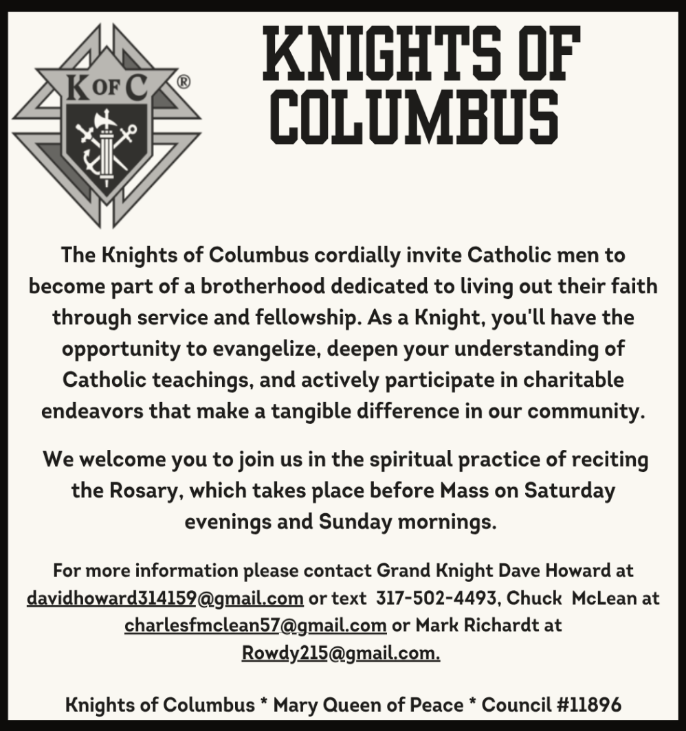 Please join the Knights each day to pray the Rosary. You can join or just pray the Rosary with the Knights on the Mary Queen of Peace Facebook page or YouTube site. Council members also lead the Rosary prior to all Saturday evening and Sunday morning Masses.